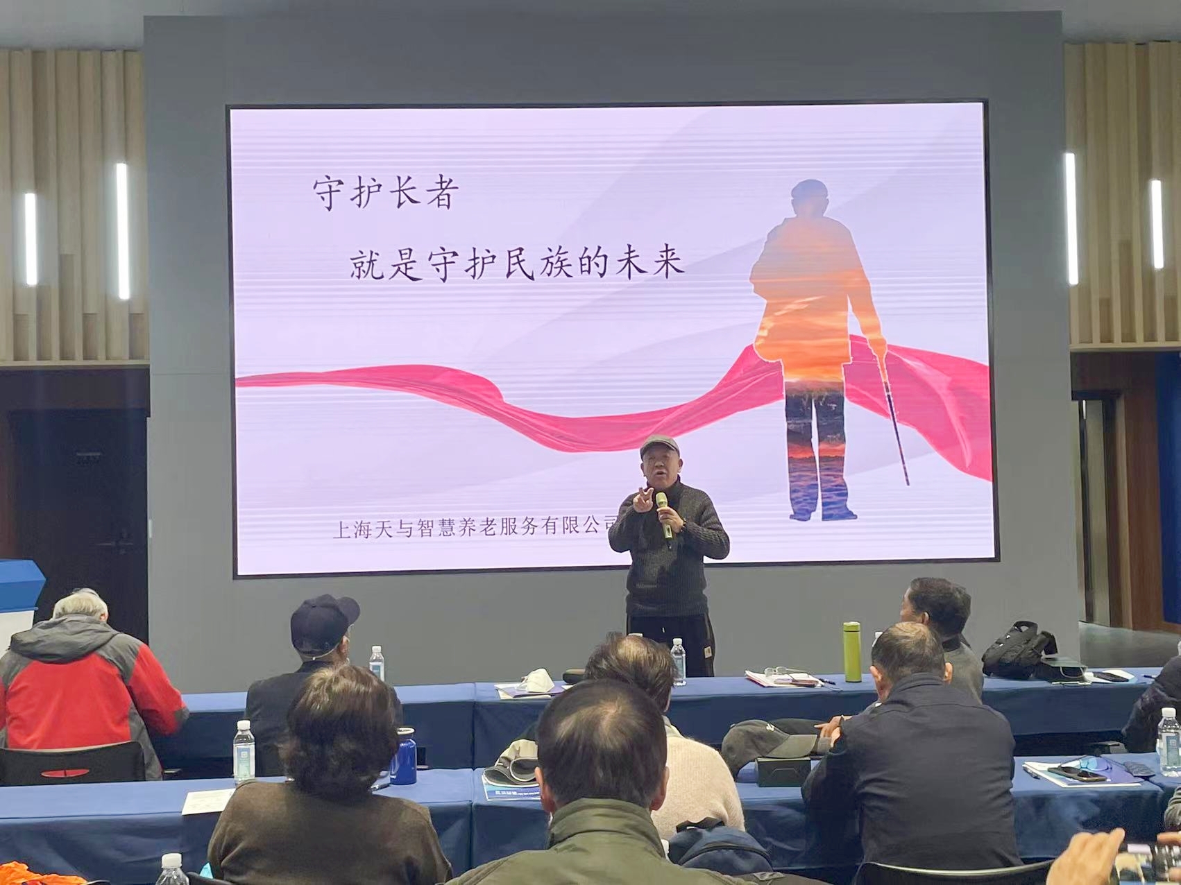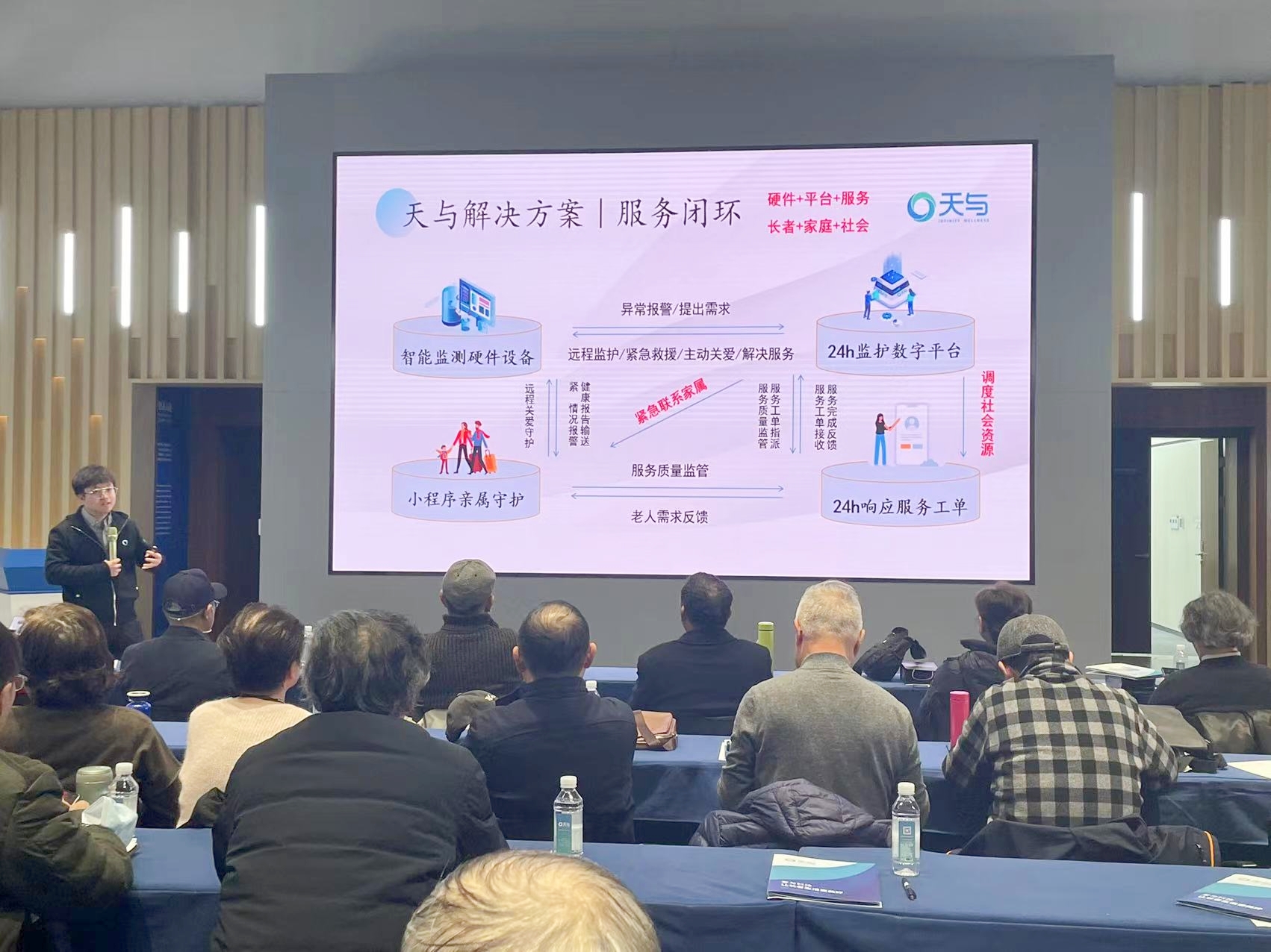 参观结束后,袁江枫以“智享居家,智慧养老”为主题进行汇报交流。他指出:“居家养老仍是中国养老模式主流,但未来居家养老应该更关注老人健康、安全,便利等需求。”作为一家养老科技公司,天与始终致力于中国养老数字基建,着力于养老行业的数字化升级改造,针对老龄化全进程,提供全球合作及自主研发的智能化养老解决方案,服务长者“安全”“健康”“陪伴”“照护”等生活全场景。