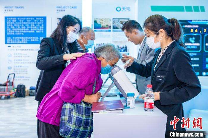 博览会现场,“天与养老”展位前的AI眼底筛查设备吸引了不少老年人的关注。上海天与养老服务有限公司总裁彭剑波介绍,该设备可以通过AI人工智能技术对老人的28种疾病风险进行筛查,包括各种眼部疾病,糖尿病、高血压、冠心病、帕金森、阿尔茨海默症、白血病、脑部肿瘤等疾病。目前,这套解决方案已经在全国三十多家三甲医院院内使用。